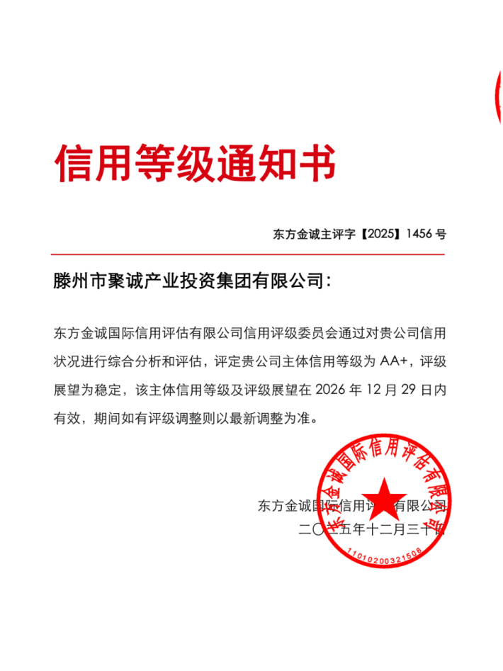 近日,市国资公司权属滕州市聚诚产业投资集团有限公司(以下简称“聚诚产投公司”)被国内权威信用评级机构——东方金诚国际信用评估有限公司评定为产投类AA+主体信用等级,评级展望为稳定。